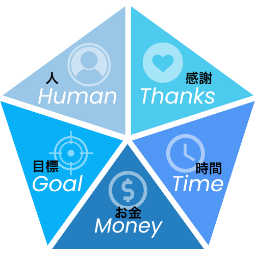 感謝(周りへの貢献)人それぞれ幸せの価値観は違いますが、幸せの本質はこの五角形だと考えています。